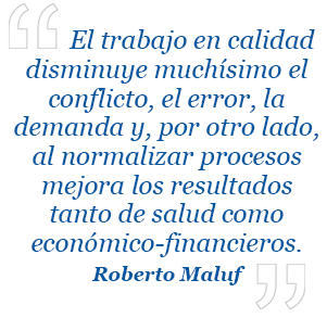 R. Maluf: El trabajo en calidad disminuye muchísimo el conflicto, el error, la demanda y, por otro lado, al normalizar procesos mejora los resultados tanto de salud como económico-financieros. Es muy evidente la diferencia entre establecimientos acostumbrados a caminar el sendero de la calidad con los que no lo han hecho. Los primeros tienen mejores indicadores de salud y económico-financieros, además de haber demostrado durante la pandemia la mejor y más rápida resolución tras la habilidad en la puesta en marcha de procesos destinados a la contención de la misma. |