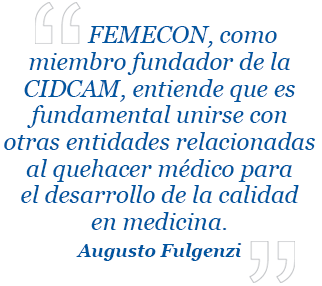 | A. Fulgenzi: Desde el año 2000 FEMECON, como miembro fundador de la CIDCAM, entiende que es fundamental unirse con otras entidades relacionadas al quehacer médico para el desarrollo de la calidad en medicina. Se calcula que entre el 20 y el 40 por ciento del gasto en salud se dispensa a causa de una atención de calidad deficiente y que la frecuencia de las infecciones intrahospitalarias puede reducirse en más de un 50 por ciento con medidas de bajo costo y fácilmente implementables. |