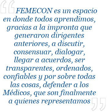 | Sobre mi experiencia en FEMECON, diría que es un espacio en donde todos aprendimos, gracias a la impronta que generaron dirigentes anteriores, a discutir, consensuar, dialogar, llegar a acuerdos, ser transparentes, ordenados, confiables y por sobre todas las cosas, defender a los Médicos, que son finalmente a quienes representamos. |